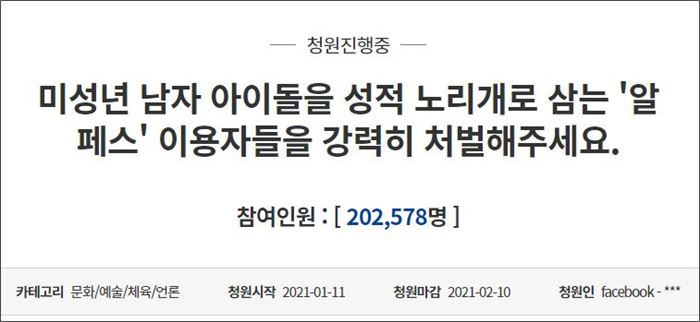 알페스(실존하는 남성연예인 등을 성적 표현의 소재로 삼아 표현물을 만드는 행위) 논란이 뜨겁다. "미성년 남자 아이돌을 성적 노리개로 삼는 '알페스' 이용자들을 강력히 처벌해달라"는 청와대 국민청원이 20만명을 넘어섰고, 맞불 성격으로 '여성 연예인들을 고통받게 하는 불법영상 '딥페이크'를 강력히 처벌해달라"는 청원도 하