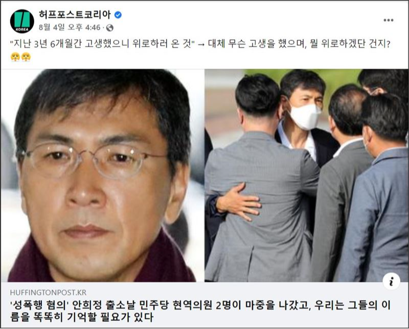 인간적 고려를 용납하지 않는 페미니즘: 안희정 출소 마중을 비난하는 허프포스트