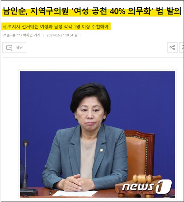 페미니스트인 더불어민주당의 남(윤)인순 의원이 지역구 국회의원 선거에서 여성을 40퍼센트 강제 할당하는 공직선거법 개정안(2108432)을 발의했다. 비례대표 후보 뿐 아니라 지역구 국회의원 후보에 여성 40퍼센트 강제 할당, 시도지사 후보에 여성 및 남성을 각각 1명 이상 추천, 시·군·구의 장 선거에는 선거구 총수의