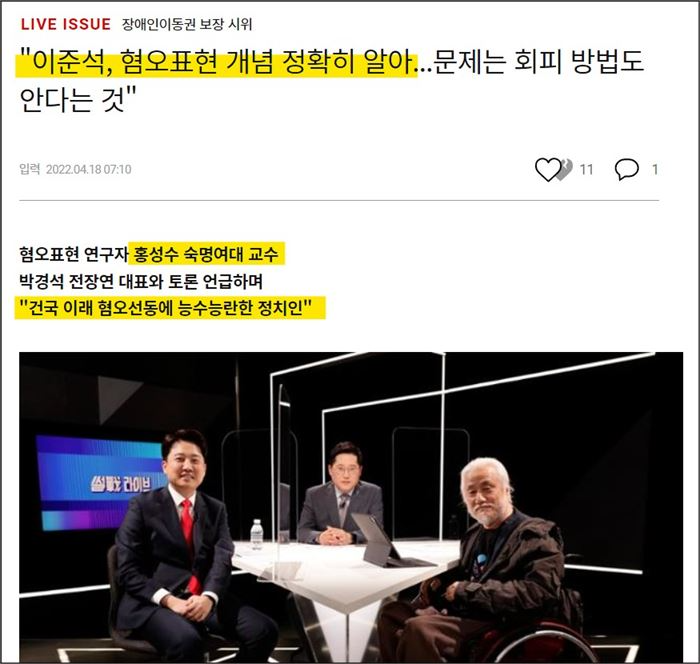이준석 대표와 전국장애인차별철폐연대 박경석 대표가 토론을 벌인 뒤 홍성수 교수는 이렇게 평가했다."이준석, 혐오표현 개념 정확히 알아...문제는 회피 방법도 안다는 것" 한국일보는 홍교수가 소셜미디어에 쓴 글을 그대로 기사에 담았는데, 그가 쓴 글을 보면 이준석 대표 뿐 아니라 그들의 심기를 불편하게 하는 사람은 누구라도