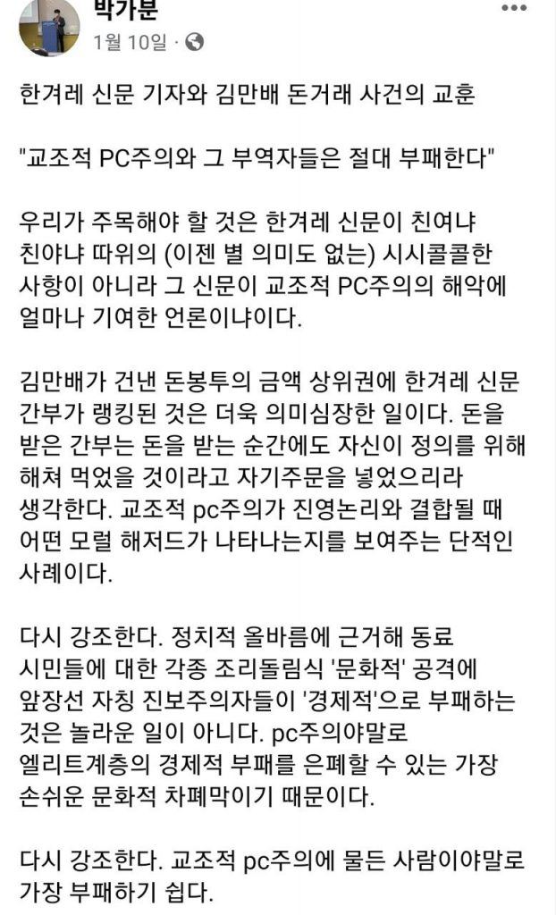 진보는 왜 부패로 귀결될 가능성이 높을까? 지난 1월, 진보진영의 논객인 작가가 한겨레 석진환 기자의 9억 수수 사례를 언급하며 PC주의자들과 부패에 대해 이야기했다. PC주의자들이 부패로 귀결될 가능성이 높다는 견해였다. 일리가 있는 주장이다. 출처: 박가분작가 페이스북 최근 전 언론노조 위원장이자 진보진영의 기