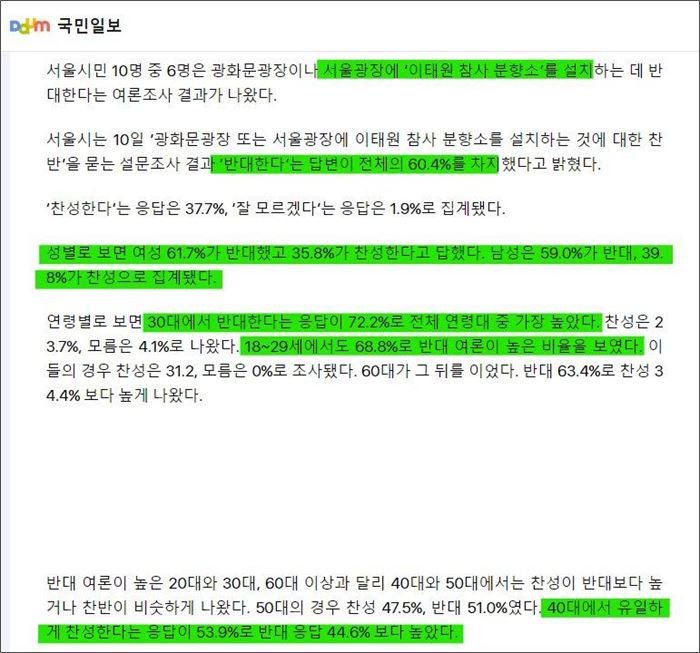 서울시민 10명 중 6명이 광화문광장이나 서울광장에 ‘이태원 참사 분향소’를 설치하는 데 반대한다는 여론조사 결과가 나왔다고 한다. 눈길을 끄는 대목은 여성이 남성보다 반대 견해가 높다는 것과, 30대에서 반대 비율이 가장 높다는 점이다. 성별로 보면 -여성 61.7%가 반대했고 35.8%가 찬성한다고 답했고, -남성은