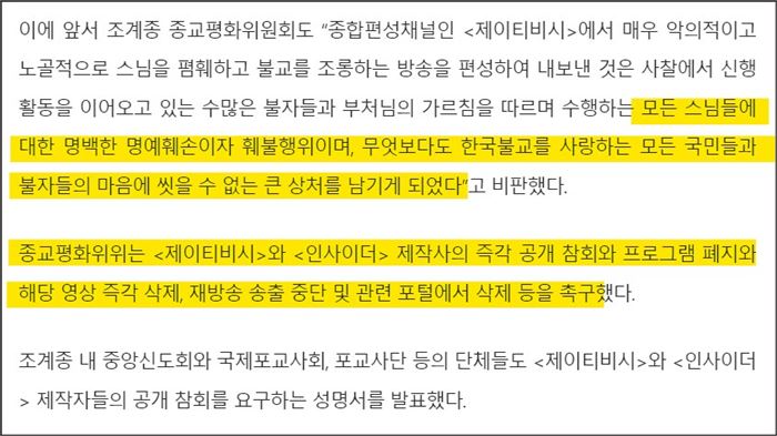 ‘조계종본사주지협의회’는 “표현의 자유라는 허울로 회피하기에는 그 정도가 지나치게 과할 뿐만 아니라 그로 인해 수많은 불자들과 국민들이 겪는 정신적 피해와 불편함은 감내하기 어려운 수준에 이르고 있다”며 강도 높은 성명을 발표했다.