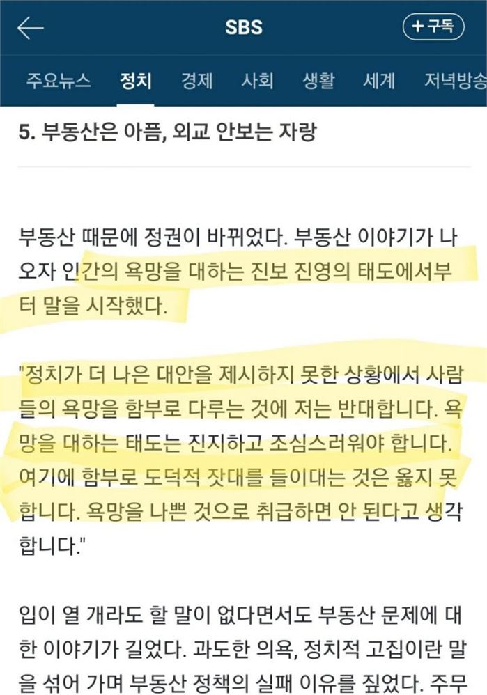 부동산 정책의 실패를 언급한 대목에서 '인간의 욕망을 대하는 진보 진영의 태도'를 반성한다며 한 말이다.
