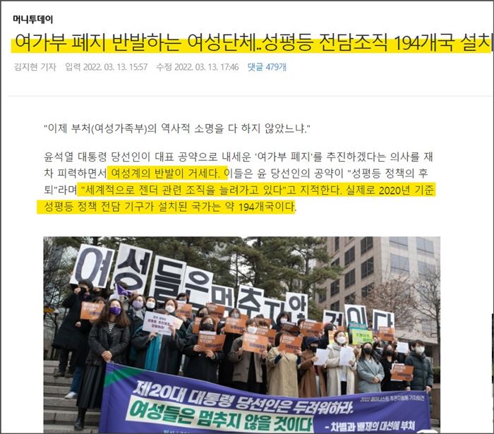 여성단체는 세계 194개국에 여가부 또는 유사기관이 설치됐다며 이를 폐지하는 건 글로벌 스탠다드 역행이라며 맹공을 퍼붓고, 페미 진영의 언론은 여기에 충실하게 스피커를 대어 증폭시킨다.