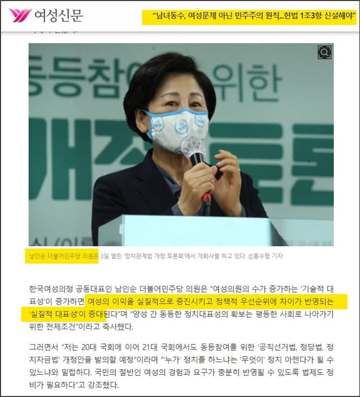 남인순 의원은 남녀동수가 민주주의라며 여성할당제를 주장한다. 어떠한 논증도 없다.