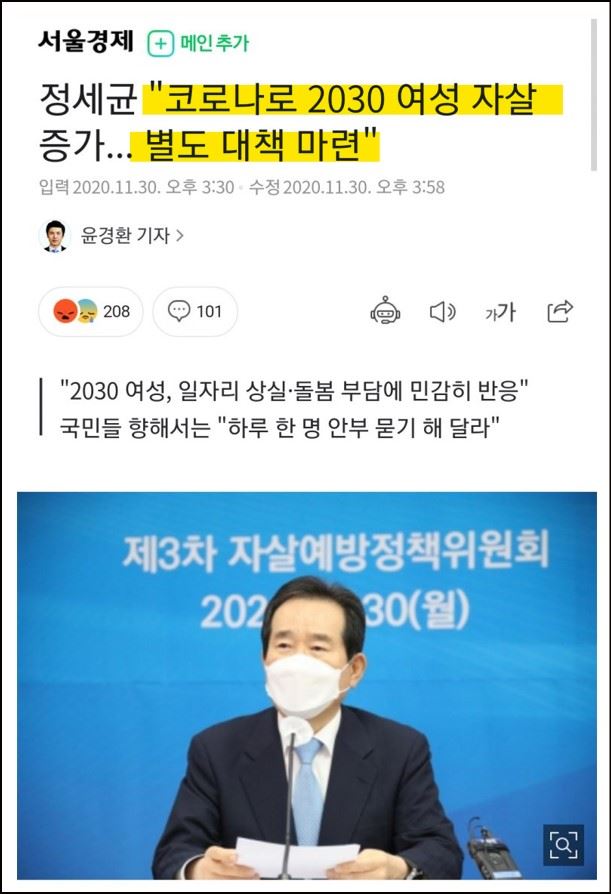 코로나 시기 여성자살에 대한 별도대책을 마련하라는 정세균 전 총리의 발언(출처: 서울경제)