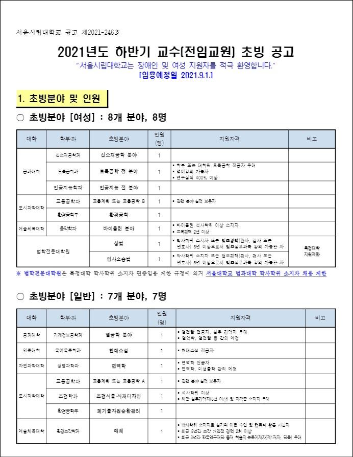 국립대 여성교원 25%강제할당조치 후 서울시립대의 교원초빙공고. 초빙분야를 여성으로 제한하고 있다.