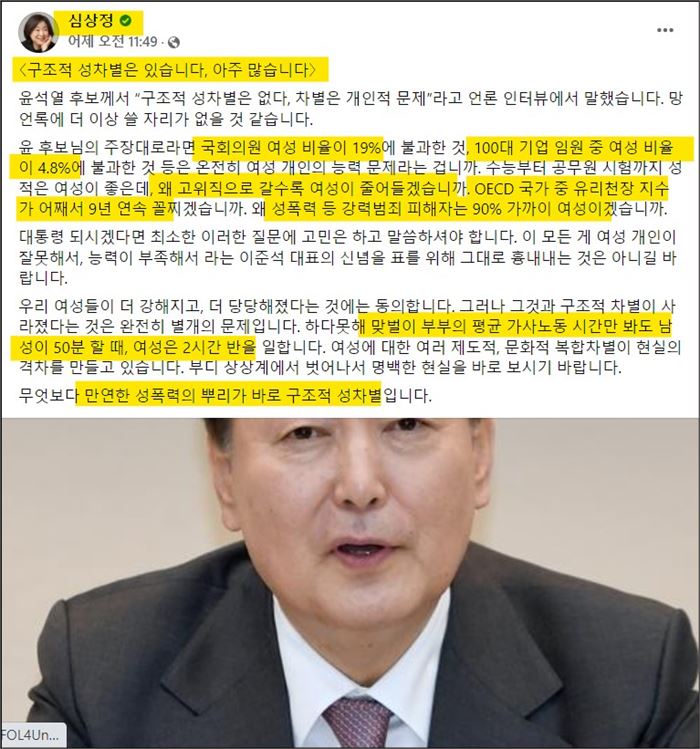 구조적 성차별이 아주 많다는 심상정 의원. 그러나 구조의 실체는 제시하지 못한다.