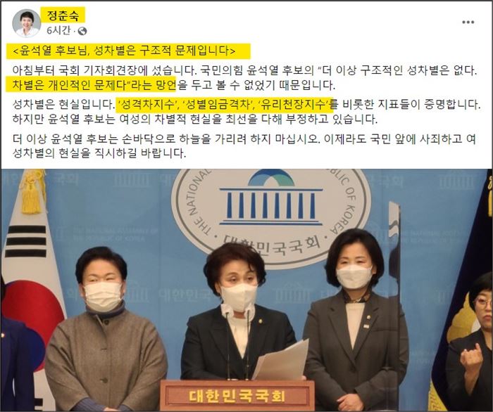 성차별은 구조적 문제라는 민주당 정춘숙 의원.