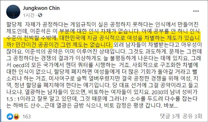 진중권 교수가 공식적으로 여성을 차별하는 제도는 없다고 발언했을 때 누구도 이를 비난하지 않았다. 진씨의 발언과 윤후보의 발언은 같은 의미의 것일수도 있다. 그러나 이에 대한 합리적 토론이나 설명은 없고 그저 비난과 공격만이 난무한다. 앞서 설명했듯 적극적 우대조치를 정당화하기 위한 맥락에서 쓰는 ‘구조적 차별’이라는 말은 이기적이며 불의한 요구를 가리기 위한 위장 언어전술이다.