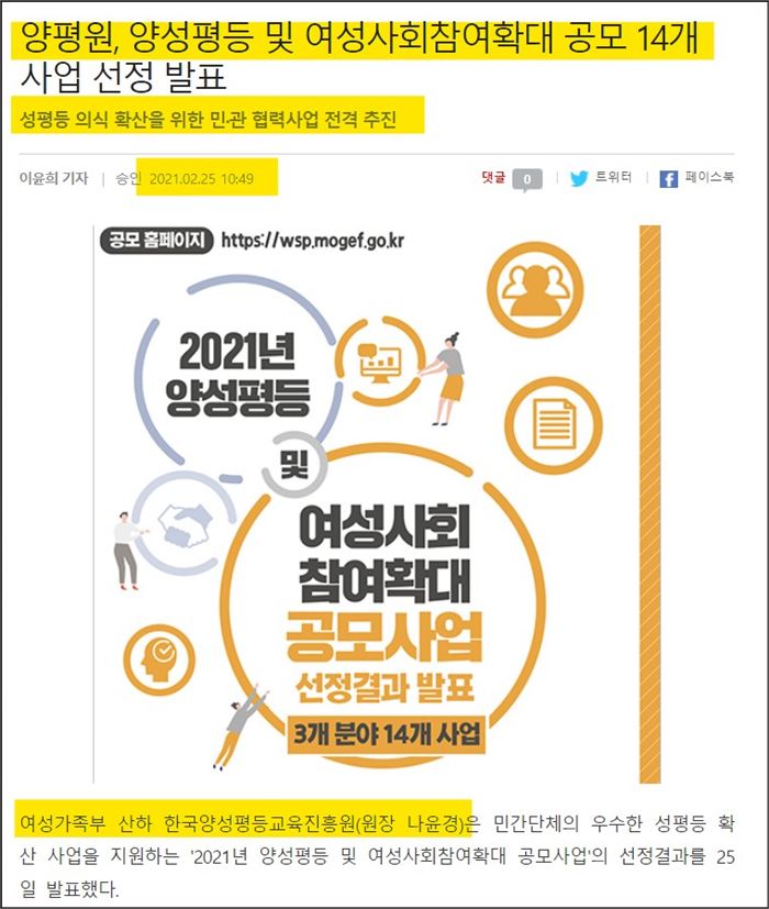 여가부 산하 양평원의 양성평등 선정사업