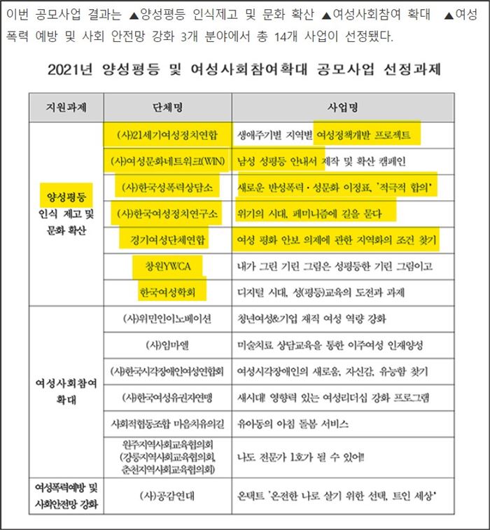 - ▶양성평등 인식제고 및 문화확산이라고 공모해놓고 선정은 전부 여성단체들