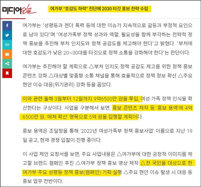 여가부가 10억원을 들여 부처 홍보에 나서겠다고 한다. 특히 부처에 대한 호감도가 낮은 20~30대를 타깃으로 정책 소통을 강화하겠다고도 한다.(미디어오늘 기사 링크)
