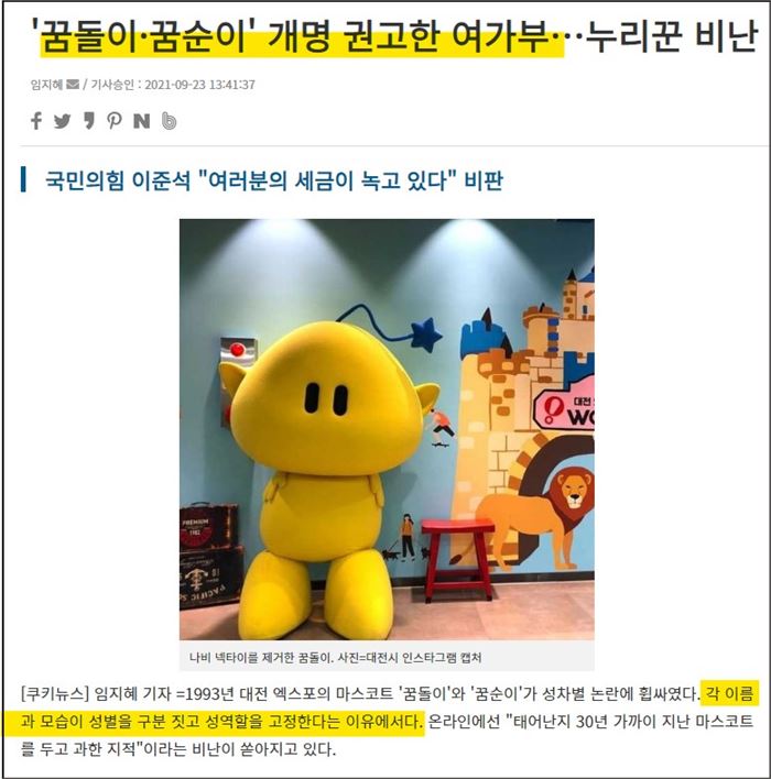최근 여가부는 대전엑스포의 마스코트인 꿈돌이 꿈순이 이름이 성차별이라며 개명을 권고했다.