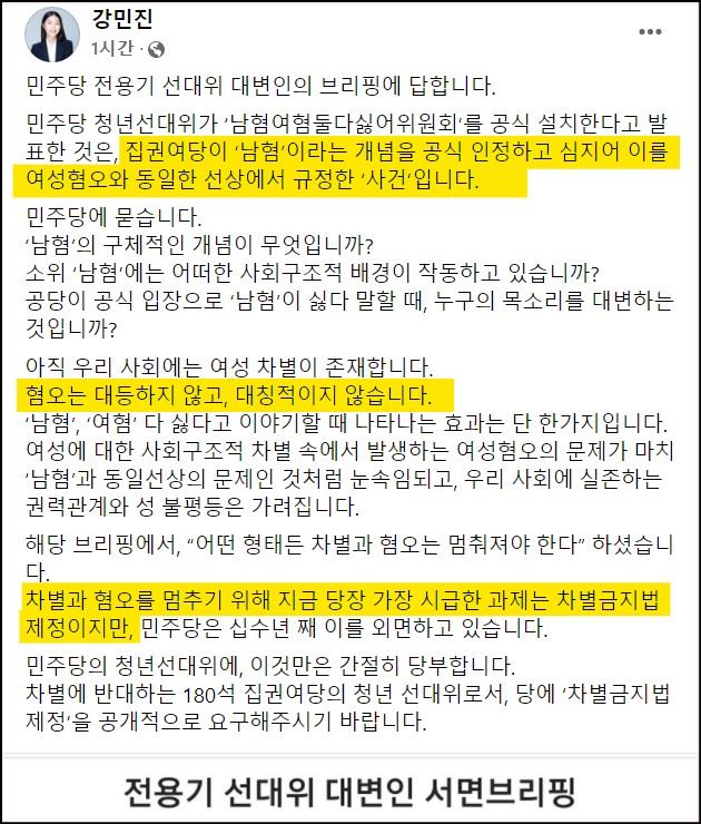 이러한 주장이 논리로 성립할 수 없는 이유는, ‘왜 성별에 따라 범위를 한정하는 ‘혐오’ 개념을 택하는가?‘라는 물음에, 다시 ‘성별에 따라 범위를 한정하는 구조적인 폭력과 차별로 인한 피해로서의 해악’ 개념을 임의로 택한 답이기 때문이다.