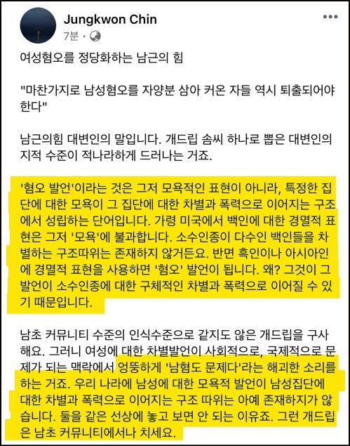 페미 진영은 늘상 가부장제 사회에서 남성에 대한 적대적인 표현은 어떠한 해악으로도 작동하지 않으므로, 그런 표현은 비난받거나 제재의 대상이 되지 않아야 한다는 논리를 편다.