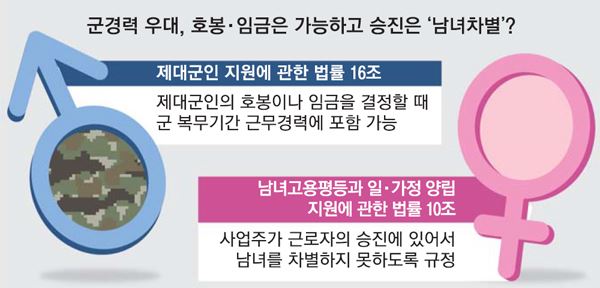 그렇다면 군경력만 평가에 산정하지 않는 행위는 오히려 남성에 대한 차별로서 「근로기준법」 제6조(균등한 처우), '사용자는 근로자에 대하여 남녀의 성(성)을 이유로 차별적 대우를 하지 못하고, 국적·신앙 또는 사회적 신분을 이유로 근로조건에 대한 차별적 처우를 하지 못한다'와, 「남녀고용평등과 일·가정 양립 지원에 관한 법률」제10조에 위반된다.