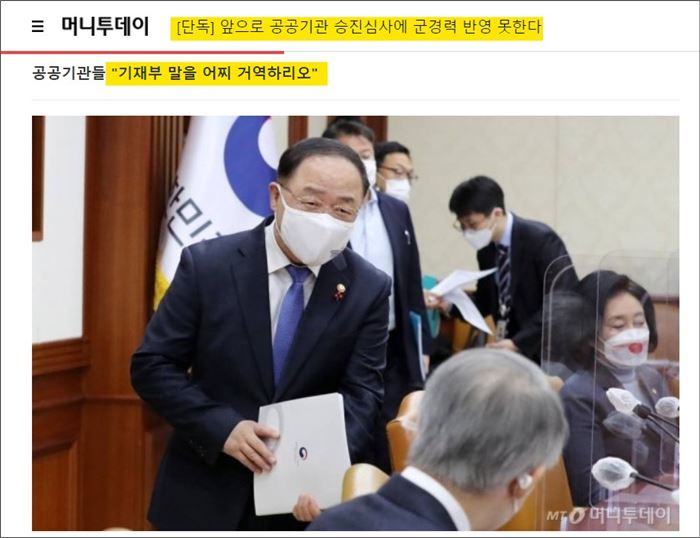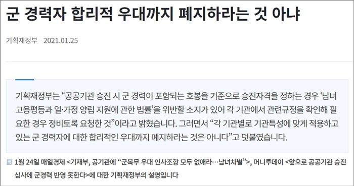 그러나 이마저도 국가가 성차별 제도 시정이라는 압박을 통해 강제로 없애는 중이다. 2021년 1월, 기획재정부는 승진 심사에 군경력을 반영하지 말라는 인사제도 개선지침을 내렸다. 36개 공기업과 95개 준정부기관, 209개 기타공공기관 등 모든 공공기관이 대상이다. 기재부는 여러 기관에서 민원이 들어왔다는 이유를 내세웠는데 정부기관이 단순히 민원만으로 이러한 지침을 내릴 수는 없다.