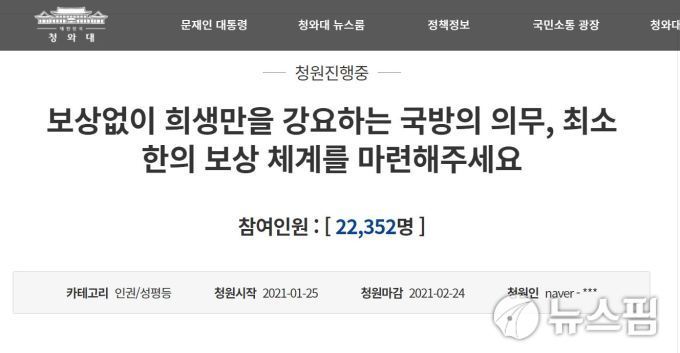 군복무 보상체계를 요구하는 청원(출처: 뉴스핌)