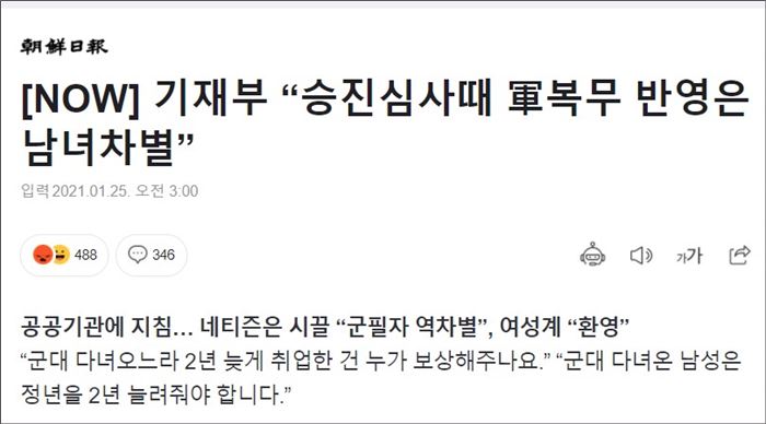 이런 분위기에서 그간 큰 화제가 된 적 없었던 이 사안이 기재부의 전격적인 지침으로 도마에 올랐다. 군복무에 대한 보상이 전무하고, 여성징병 청원이 나흘만에 20만명을 넘기는 등 성별 갈등의 뇌관인 군대 문제가 다시 현안으로 부각되고 있는 것이다.