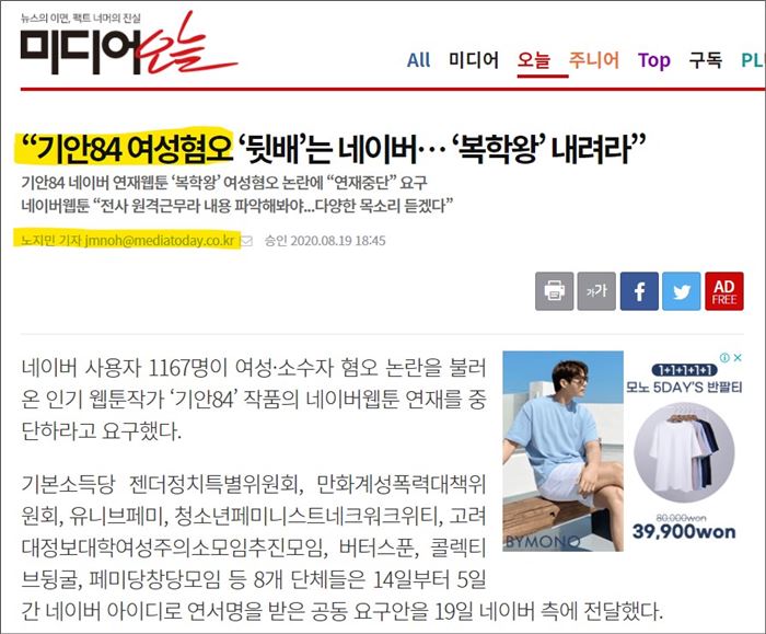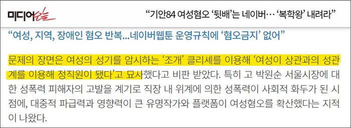 일부 온라인 매체, 경제지, 통신사들은 ‘남혐논란’을 제목에 붙여 ‘커뮤니티 받아쓰기’를 일삼았다.