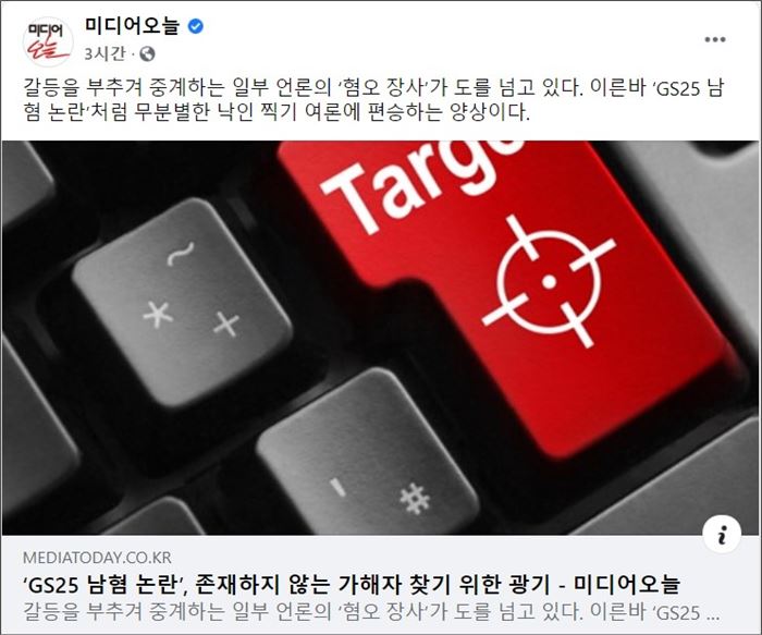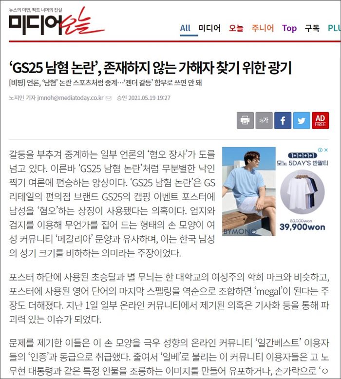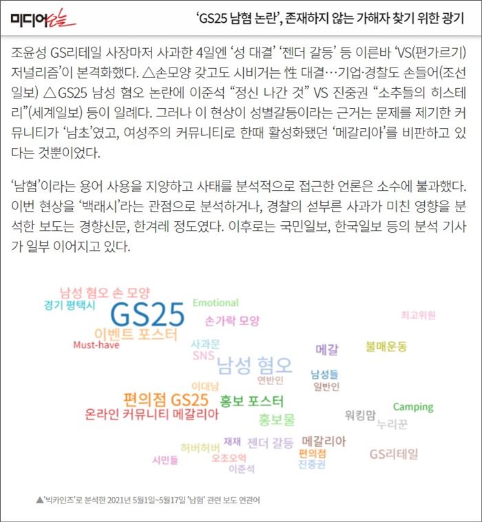 미디어오늘이 GS25 남혐손가락 논란 관련 보도를 비평하는 기사를 썼다.