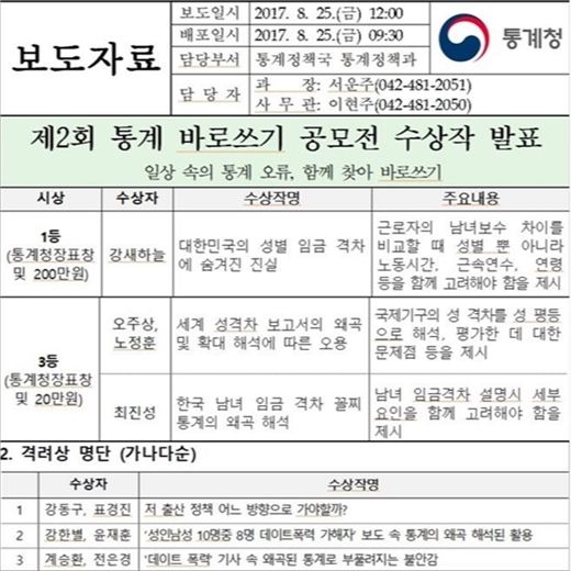 통계청 주관의 통계바로쓰기 공모전에는 페미니스트 진영이 왜곡하거나 부풀리는 통계의 진실을 다룬 수상작이 다수를 차지한다.