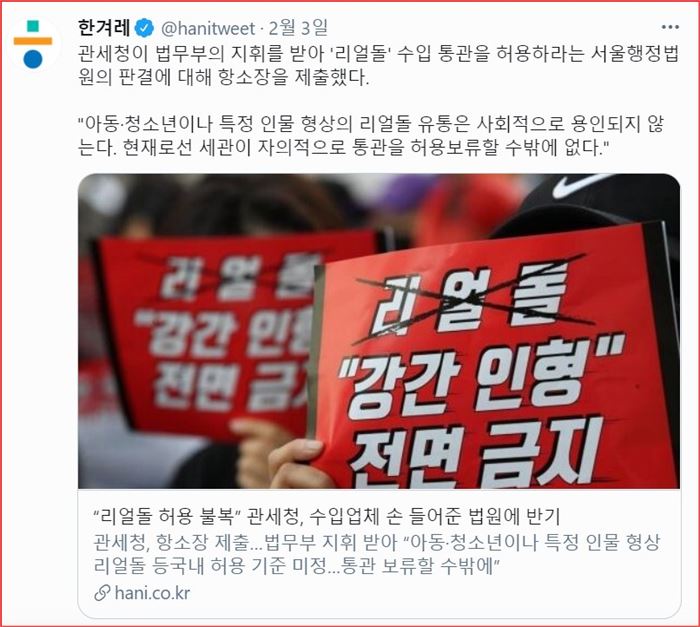 리얼돌은 강간인형이라는 페미니스트와 이를 지지하는 한겨레의 보도