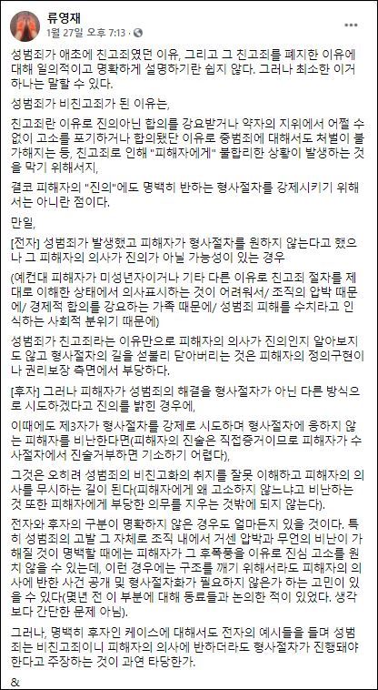 그러나, 명백히 후자인 케이스에 대해서도 전자의 예시들을 들며 성범죄는 비친고죄이니 피해자의 의사에 반하더라도 형사절차가 진행돼야 한다고 주장하는 것이 과연 타당한가?”(류영재 판사의 페이스북)