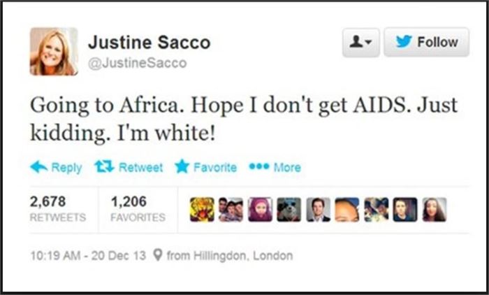 이 트윗 하나가 그녀의 인생을 바꿔놓았다. 팔로워를 많이 거느린 기자 샘 비들(Sam Biddle)이 그 트윗을 리트윗 했고, 삽시간에 그녀는 전 세계인 앞에 인종차별주의자가 되었다. 회사는 사과문을 썼지만 대중은 그녀의 해고를 요구했다. 저스틴 사코의 이름은 불과 열흘 사이에 122만 번이나 검색되었고, 끔찍한 비난에 시달렸다. 대중의 공격으로 결국 직장마저 잃었다.