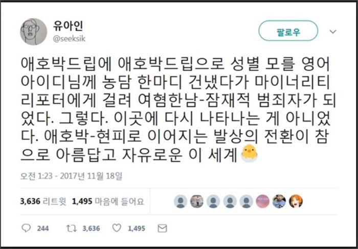 "성별도 실체도 없는 익명들, 하지만 웹상에 쏟아져 눈앞에 펼쳐지는 언어라고 부를 수 없는 배설물들. 여론을 농단하고 온라인 생태계를 넘어서 사회를 교란하며 진짜 피해자와 사회적 약자들과 모든 인간의 존엄함, 그리고 숭고한 인권 운동의 얼굴에 먹칠을 하는 저 집단의 만행에 감정과 상식과 논리로 대응하는 것이 어리석은 일입니까.