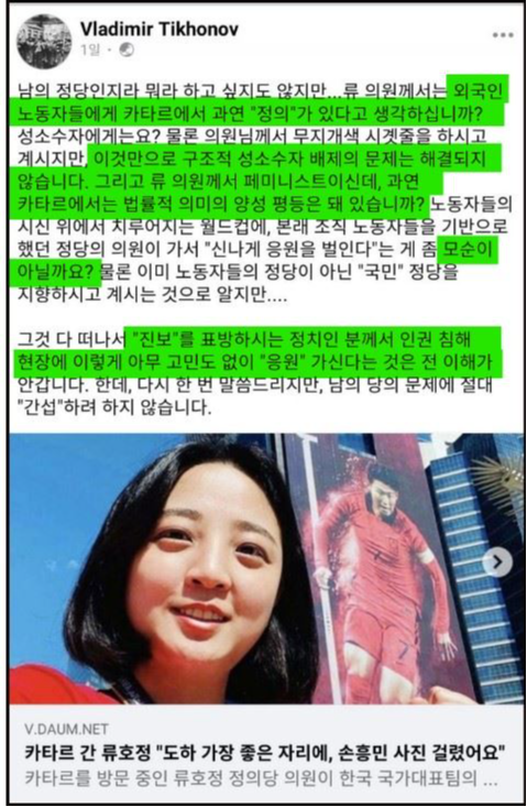 카타르에서 소수자들을 생각했다는 류호정의원 기사