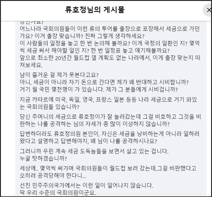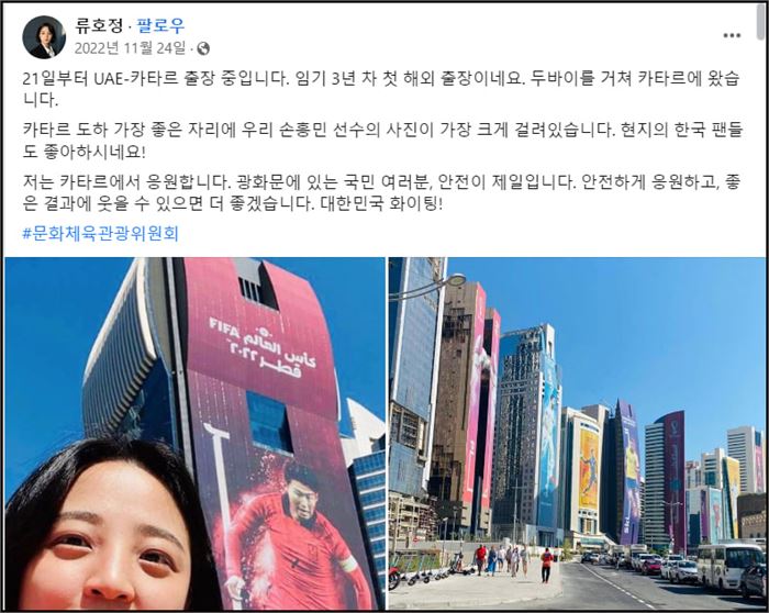 2022년 11월 류호정 의원이 카타르월드컵에 응원단으로 방문해 인증샷을 올리자 여론이 좋지 않았다.