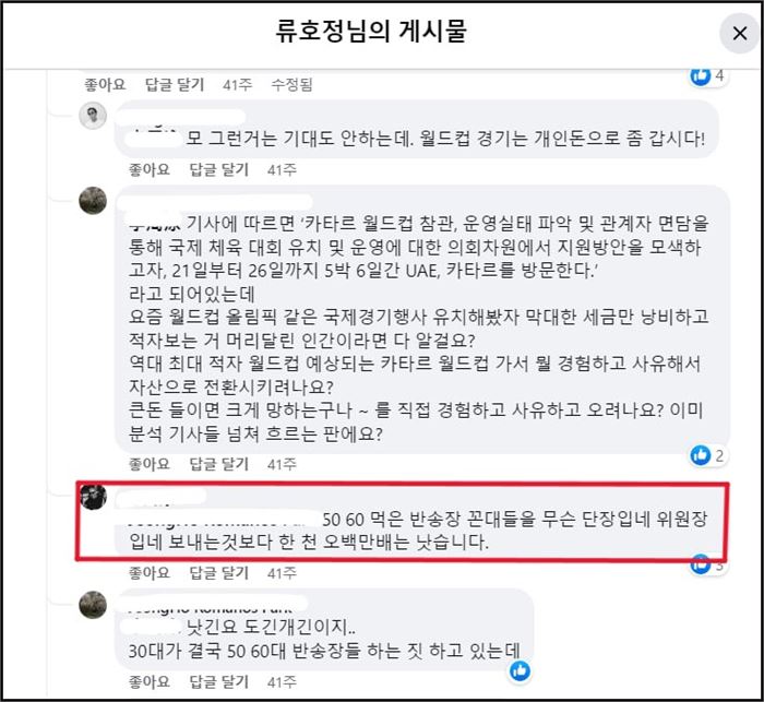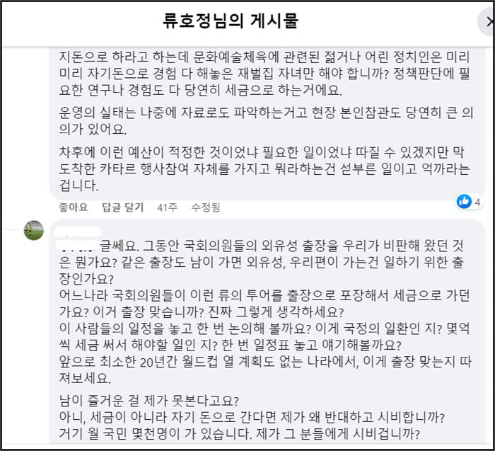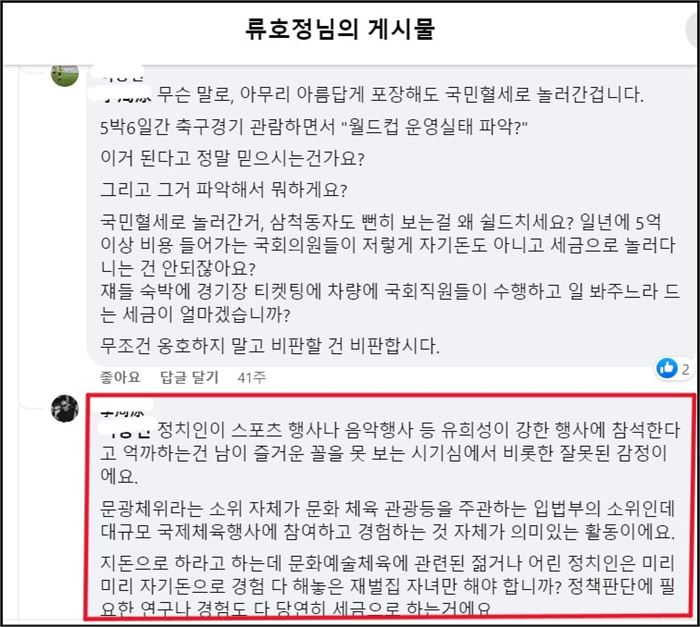 류호정 의원이 소셜미디어에 응원사진을 올리자 '월드컵 경기는 개인돈으로 좀 가라'는 비판글이 달렸다. 국제 체육대회 유치 및 운영에 대한 의회차원의 모색이라는 명분에 대한 비판도 이어졌다.