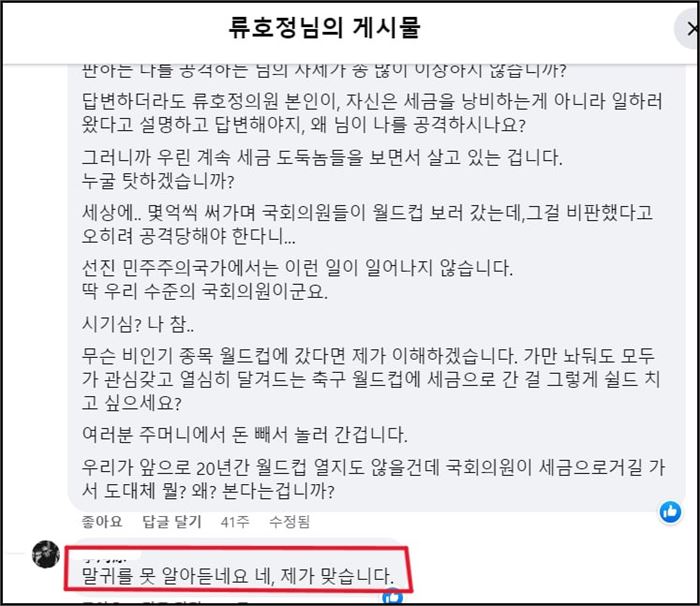 류호정 의원의 행동을 비판하는 댓글이 다수 달리자 그녀의 지지자가 이런 댓글로 응수했다. 이 댓글 논쟁을 보면 왜 진보인사들이 부패와 타락에 무감해지는지 알 수 있다.