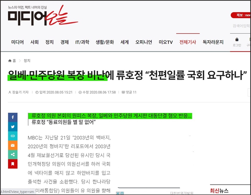 복장에 대한 비난을 일베의 혐오로 몰아가는 미디어오늘의 기사