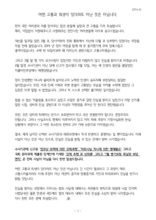 박완주 의원은 혐의사실을 부인하고 있다. 제명당한 후 당의 결정은 이해하지만 아닌 건 아니므로 법적으로 대응하겠다는 입장문을 냈다. 과거 안희정 사건에서 보였던 자신의 발언에 대해 한 번 돌아보았을까?