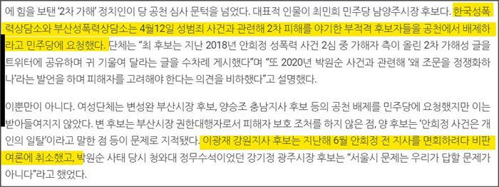 양승조 민주당 전 충남도지사 후보는 안희정 전 지사가 수감된지 3년이 넘은 시점에서 인간적인 관계로 면회를 가겠다고 했다가 페미 단체가 2차가해라며 지방선거 공천배제를 요구하고 항의하자 사과했다. 그 뒤 면회도 가지 않았다고 해명했다. 양승조 전 후보 또한 성추행 혐의로 피소됐다.(양 전 후보에 대한 고소는 2022년 8월8일 경찰이 혐의사실을 찾지 못해 불송치 결정을 내렸다.)