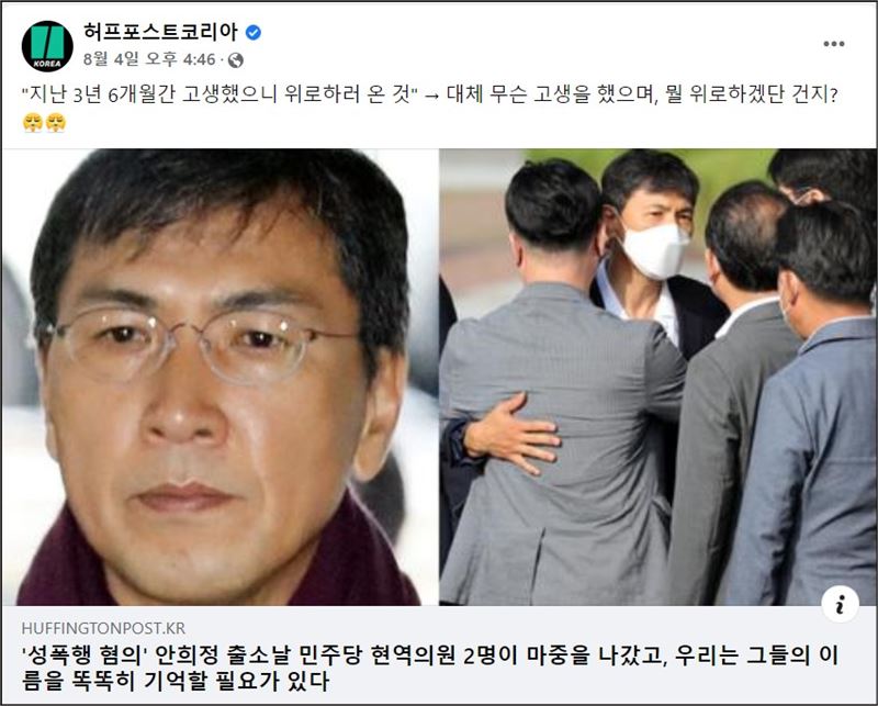 대체 무슨 고생을 했으며, 뭘 위로하겠단 건지?" "성폭행 혐의 안희정 출소날 민주당 현역의원 2명이 마중을 나갔고, 우리는 그들의 이름을 똑똑히 기억할 필요가 있다."