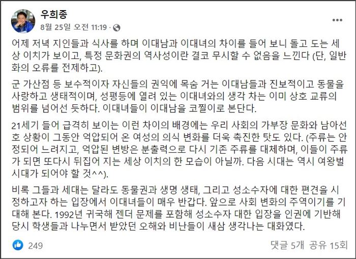 기성세대 진보적 지식인 남성들의 생각을 말해주는 우희종 교수의 견해(출처: 우희종교수 페이스북)