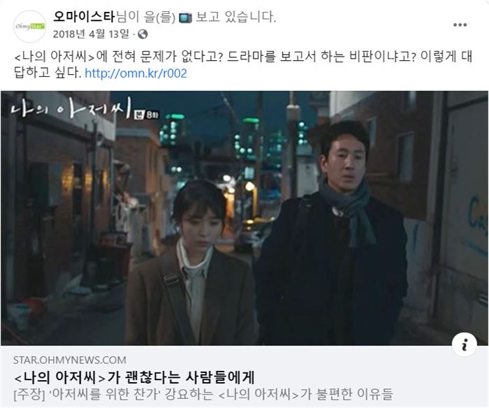 페미니즘을 지지하는 대중들까지 가세해 <나의 아저씨>는 방영 내내 오해와 왜곡, 보이콧 선동을 감내해야 했다. 아저씨를 위한 찬가를 강요하는 드라마라던 오마이뉴스의 비난 기사 또한 이 공격에 한 몫을 했다.