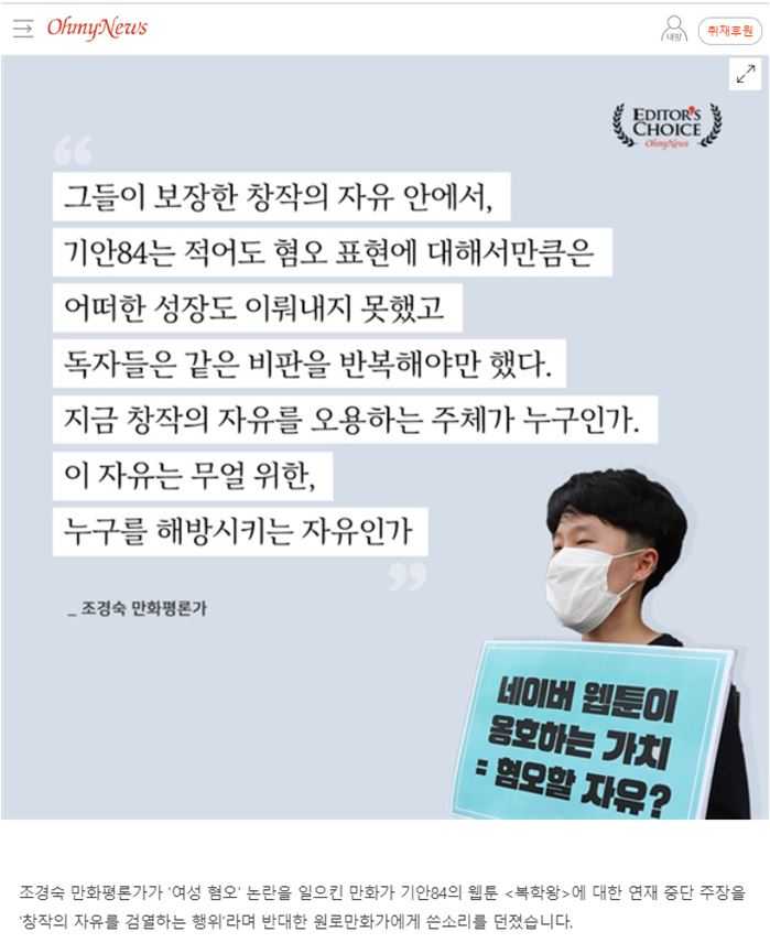그러나 오마이뉴스가 이러한 주장에 힘을 실어 대중문화 콘텐츠에 대한 검열이나 표현의 자유 억압을 반대하려면, 그간 드라마, 영화, CF, 웹툰의 한 장면들을 검열하고 여성혐오라 낙인찍어 출연진과 제작진을 공격해온 페미니스트에 대해서도 같은 태도를 견지했어야 한다.