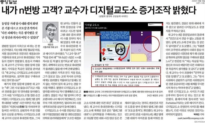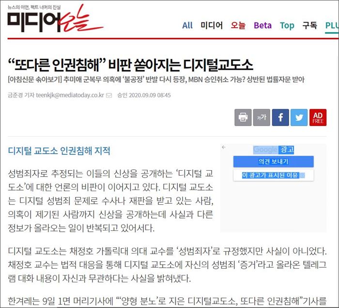 그러나 온라인 린치 행위와 사적 제재를 비난하고 처벌하라는 여론은 찾기 어려웠다.   디지털교도소의 증거조작을 밝혀낸 A교수 기사(중앙일보)   지난 9월 9일 미디어오늘은 뉴스 솎아보기 꼭지에 디지털교도소에 대한 타매체의 보도를 다뤘다.