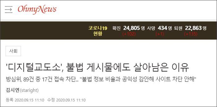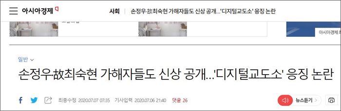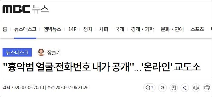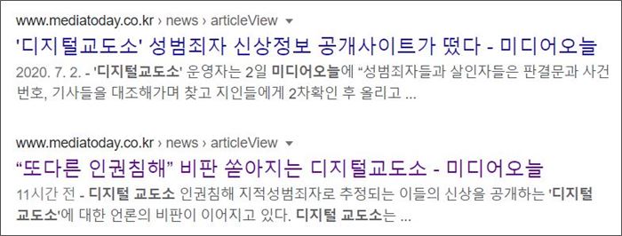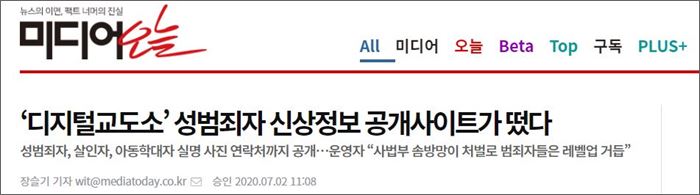 제목은 ““또다른 인권침해” 비판 쏟아지는 디지털교도소”였다. 미디어오늘은 한겨레의 머리기사를 인용했다. “성범죄자로 추정되는 이들의 신상을 공개하는 ‘디지털교도소’에 대한 언론의 비판이 이어지고 있다.