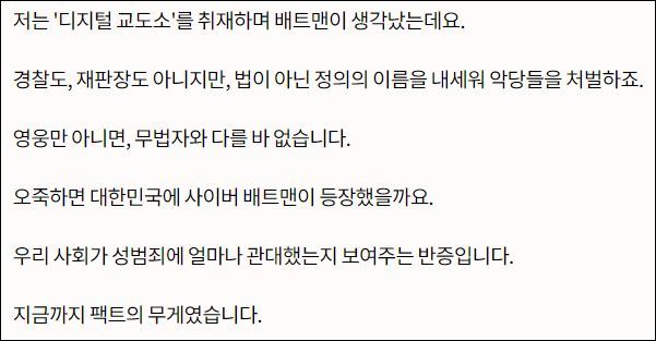 장슬기 기자는 “오죽하면 대한민국에 사이버 배트맨이 등장했겠느냐”며 옹호한다.