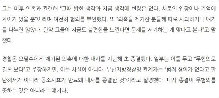 한겨레는 오달수가 무혐의라 알고 있는 사람들이 많은데 내사종결은 무혐의가 아니라고 설명한다.