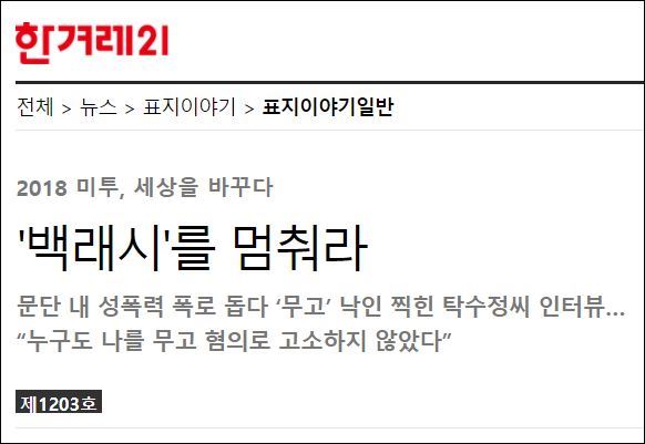 미투운동을 적극 지지하며 별도의 섹션까지 마련한 한겨레는 그녀와 인터뷰를 했다.