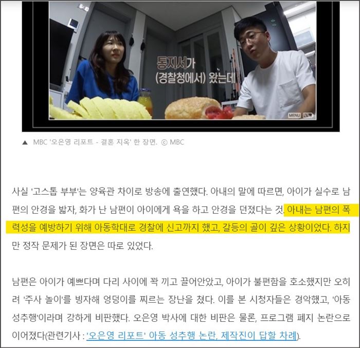 다만 논란이 된 결혼지옥 편에서 내가 문제라고 느낀 것은 다른 대목이다. 아이의 엄마는 이미 남편을 아동학대 혐의로 경찰에 신고한 이력이 있다. 방송에서 스스로 이를 밝혔다. 남편 또한 그녀의 신고로 당황했다고 말한다.