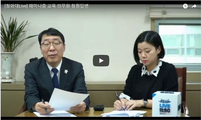 지난 1월 6일 청와대 국민청원게시판에는 '초.중.고 학교 페미니즘 교육 의무화' 청원이 올랐다. 이 청원은 만료기간인 2월 5일 21만3,219명의 서명으로 마감됐다. 청와대는 20만 명 이상이 참여한 청원에는 답변을 하기로 한 방침에 따라 2월 27일 국민소통수석이 직접 답변을 했다. 답변의 요지는 이렇다.